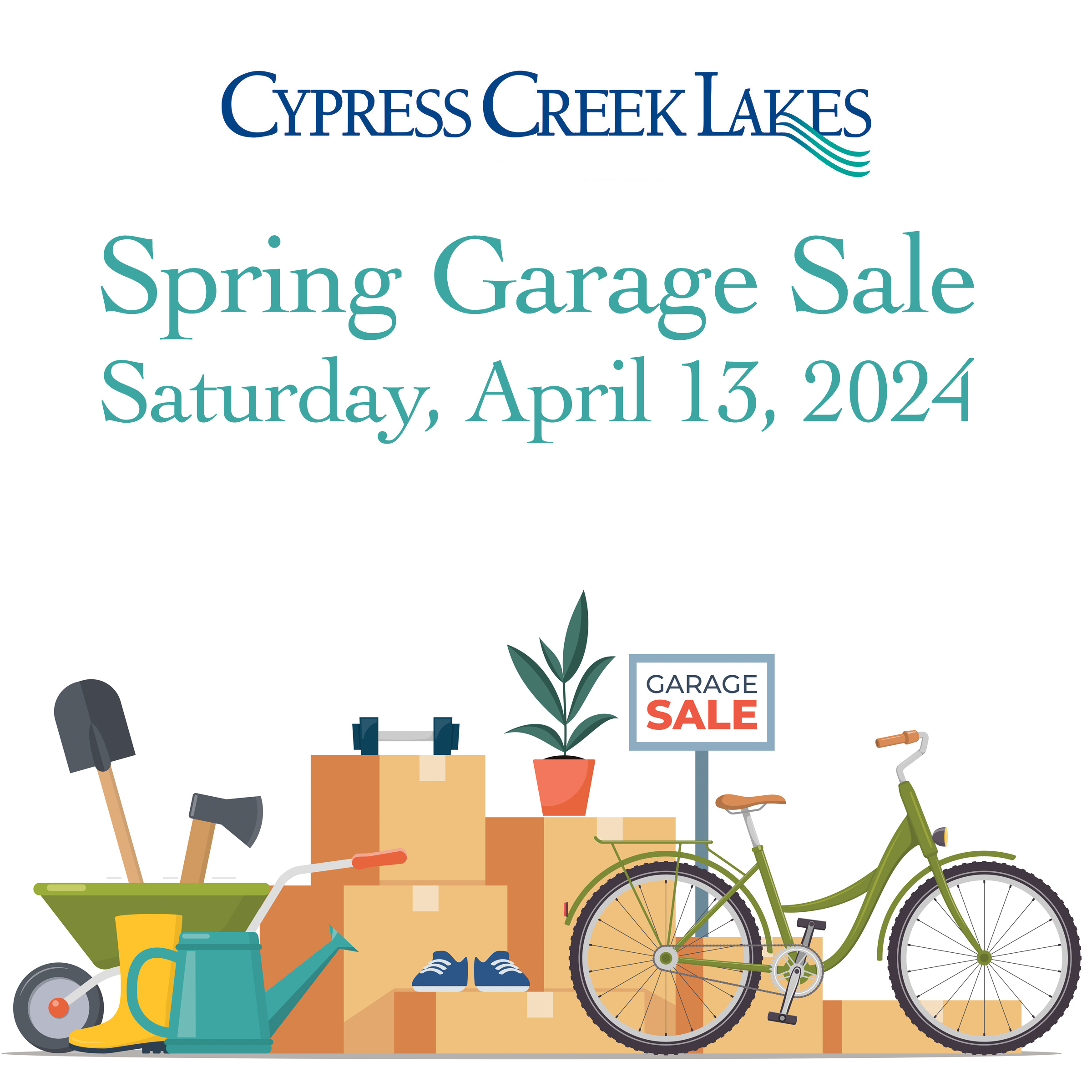 2024-04-13 Spring 2024 Garage Sale The Cypress Creek Lakes Spring Garage Sale will be held Saturday, April 13, 2024.